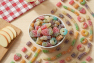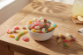 İçindekiler : Glikoz şurubu, şeker, su,kıvam arttırıcı (sığır jelatini),asitlik düzenleyiciler (Sitrik Asit ve/veya Malik Asit, Sodyum Malat), aromalar (elma,portakal,limon,çilek,ananas,ahududu,böğürtlen,vişne şeftali,üzüm,kola,mandalina,karışık meyve), yapışmayı önleyici (bitkisel yağ veya karnauba mumu), renklendiriciler ( tartazin, sunset yellow FCF,brillant blue,allura red AC,caramel)
